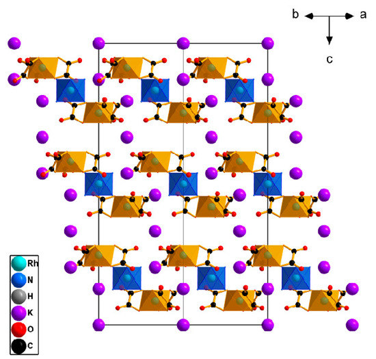 The pseudo-layers perpendicular to the c axis and formed by [Rh(C2O4)3]3− anions and potassium and [Rh(NH3)6]3+ cations (Figure 4) could be separated in the crystal structure. The cationic layers are divided into two types: the first layer is filled with K+ and [Rh(NH3)6]3+, and the second is filled only with K+. The distances between anionic layers are 5.02 and 4.73 Å. With sequential stacking, the layers are shifted towards each other by 1/3 of the vector [1 −1 −1].