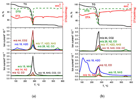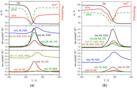 TGA (black line), DTA (red line) and EGA-MS curves for the decomposition of [Co(NH3)6][Rh(C2O4)3] ((a) in a hydrogen atmosphere, (b) in a helium atmosphere).
