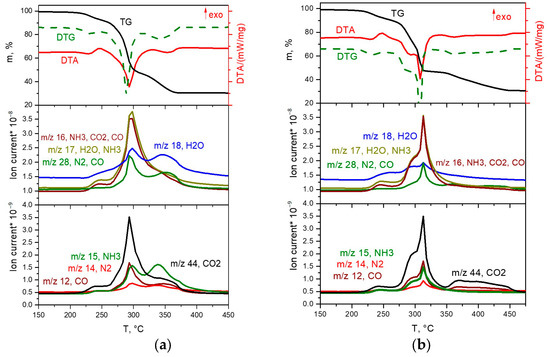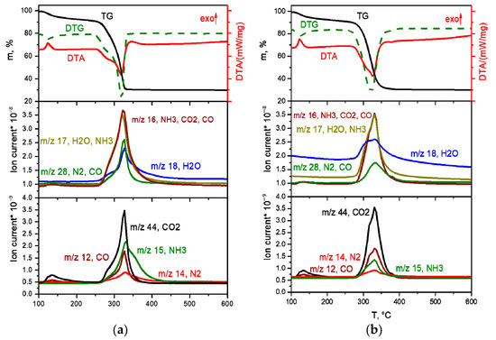 The decomposition of the [Rh(NH3)6][Co(C2O4)3] complex salt in inert and reducing atmospheres is almost identical (Figure 8a,b). The main difference is the lower temperature of the end of the thermolysis process in the reducing atmosphere (340 °C) compared to the inert (380 °C), as well as the release of greater amounts of ammonia at the third stage of decomposition. Let us consider in detail the decomposition of the complex in a reducing atmosphere.