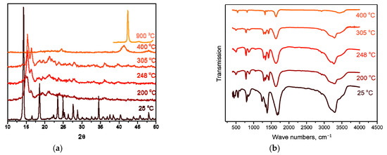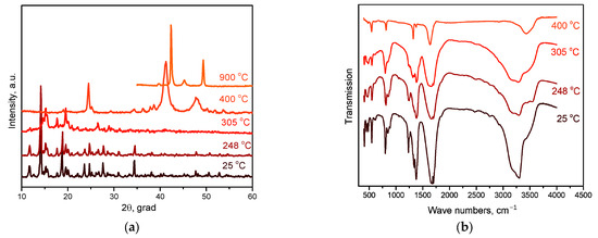 At the second stage of decomposition in the temperature range of 260–310 °C, further decomposition of the intermediate product formed at the first stage occurs. According to mass spectrometry, the main gaseous products are NH3, N2, CO, CO2 and H2O. IR spectrometric data of intermediate products obtained at different temperatures (Figure 7b) indicate that the peaks related to the vibrations of ammonia molecules (1334 cm−1 δs(HNH), 3300 cm−1 νa(NH3), 3147 cm−1 νs(NH3), 849 cm−1 ρr(NH3) and 449 cm−1 ν(CoN)), as well as those related to the vibrations of Rh-O (810, 800, 482 cm−1 ν(Rh-O)), decrease with the increasing final heating temperature. In the IR spectrum of the product obtained in the second stage at a temperature of 305 °C, only vibrations related to oxalate vibrations (1638 cm−1 νa(CO), 1379, 1321 cm−1 νs(CO), 818 cm−1 δ(O–C=O)) and Co-O vibrations (484 cm−1 ν(Co–O)) are observed, which indicates the complete decomposition of the “Rh(NH3)3(C2O4)1.5” intermediate product. According to XRD (Figure 7a), the product obtained at a temperature of 305 °C contains CoC2O4 and an amorphous phase. The total mass loss at the first and second stages is ~53%, and the mass of the intermediate product is 47%. Theoretical calculations yield a 52.7% mass loss, which is in good agreement with the experimental data. The equations of the process reaction are: