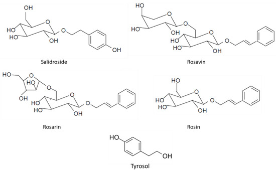 Salidroside is a glucoside of tyrosol (2-(4-hydroxyphenyl)ethyl-β-d-glucopyranoside). Rosavin ((2E)-3-Phenylprop-2-en-1-yl α-l-arabinopyranosyl-(1→6)-α-d-glucopyranoside), rosarin ((2E)-3-Phenylprop-2 en-1-yl α-l-arabinofuranosyl-(1→6)-β-d-glucopyranoside), and rosin (trans-cinnamyl O-β-d-glucopyranoside) are cinnamyl alcohol glycosides [4,5,18,35,45]. Their chemical structures are shown in Figure 2.