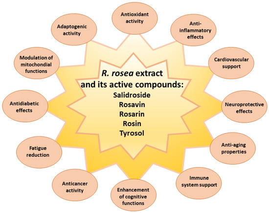 Chronic diseases, also known as non-communicable diseases, are long-term health conditions that typically progress slowly and persist over an extended period [56]. Unlike acute illnesses that have a sudden onset and short duration, chronic diseases tend to be ongoing and may require long-term management and care. The most common chronic diseases include cardiovascular diseases, e.g., heart disease and stroke; cancer; chronic respiratory diseases, e.g., chronic obstructive pulmonary disease and asthma; diabetes; obesity; neurological disorders, e.g., Alzheimer’s disease and Parkinson’s disease; depression; anxiety autoimmune disorders, e.g., rheumatoid arthritis and multiple sclerosis; chronic kidney disease; liver disease, and many others [56]. Chronic diseases, influenced by a combination of genetic, behavioral, environmental, and socio-economic factors, are a significant global health concern [57]. Managing chronic diseases often involves long-term treatment, lifestyle modifications, and regular monitoring in order to control symptoms, slow disease progression, prevent complications, and improve the quality of life for patients living with these conditions [57]. R. rosea potential to alleviate stress, reduce fatigue, and improve cognitive function can enhance overall well-being and quality of life of patients with chronic diseases [31,33]; therefore, R. rosea supplements may have potential benefits as an adjunctive therapeutic approach.