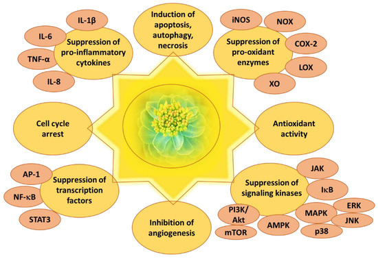 Anticancer effects of Rhodiola rosea L. and its bioactive compounds. IL—interleukin; TNF—tumor necrosis factor; AP-1—activator protein 1; NF-κB—nuclear factor kappa-light-chain-enhancer of activated B cells; STAT3—signal transducer and activator 3; iNOS—inducible nitric oxide synthase; NOX—NADPH oxidase; COX-2—cyclooxygenase-2; LOX—lipoxygenase; XO—xanthine oxidase; JAK—Janus kinase; IκB—IκB kinase; MAPK—mitogen activated protein kinase; ERK—extracellular-signal-regulated kinase; JNK—c-Jun N-terminal kinase; p38—p38 kinase; AMPK—AMP-activated protein kinase; PI3K—phosphatidylinositide 3-kinases; Akt—protein kinase B; mTOR—mammalian target of rapamycin.