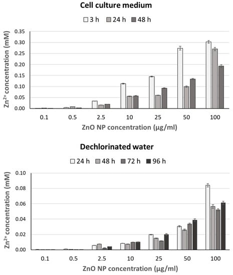 Analysis of Zn2+ ions released from ZnO NPs in cell culture medium and dechlorinated water. Bars represent the standard deviation.