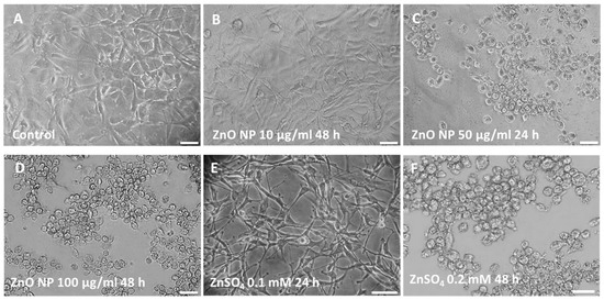 Morphology of A172 glial cells subjected to different treatments: control (A), treated with ZnO NPs at 10 µg/mL (B), 50 µg/mL (C), and 100 µg/mL (D) and treated with ZnSO4 at 0.1 mM (E) and 0.2 mM (F). Scale bar: 50 µm.