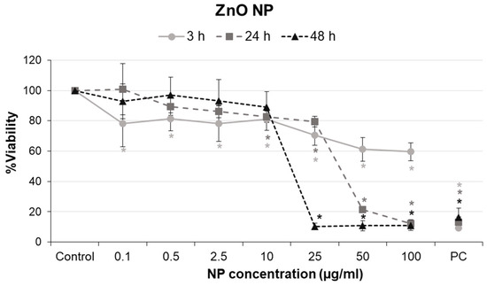 Cytotoxicity of ZnO NPs in A172 glial cells at different exposure times. PC: positive control. Bars represent mean ± standard error. * p < 0.05, significant difference regarding the corresponding control.