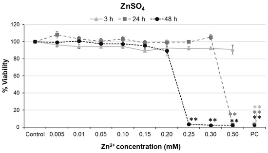 Cytotoxicity of ZnSO4 in A172 glial cells at different exposure times. PC: positive control. Bars represent mean ± standard error. ** p < 0.01, significant difference regarding the corresponding control.