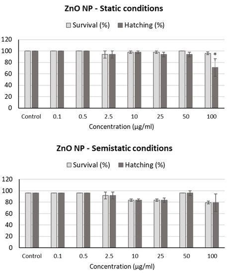 Survival and hatching in zebrafish embryos exposed to ZnO NPs for 96 h. * p < 0.05; significant difference regarding the corresponding control.