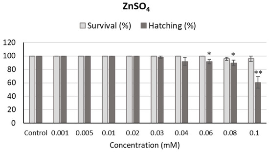 Survival and hatching in zebrafish embryos exposed to ZnSO4 for 96 h. * p < 0.05; ** p < 0.01, significant difference regarding the corresponding control.