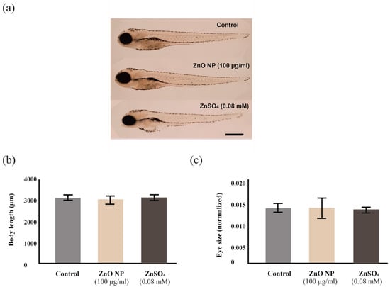 In order to detect the presence of sublethal toxicity, various morphological characteristics of the embryos exposed to ZnO NPs (100 µg/mL) and ZnSO4 (0.08 mM, corresponding to the maximum concentration of Zn2+ released by the ZnO NPs in dechlorinated water) were analyzed at 96 hpf, including body length and eye size (normalized to body length). Exposure to ZnO NPs or ZnSO4 did not induce alterations in the morphological features assessed (body length and normalized eye size) compared to control embryos (Figure 7a–c). Still, it was noticed that a small percentage of embryos treated with ZnSO4 (20%) showed alterations in the dorsal craniofacial region (not shown), which were not observed in those exposed to ZnO NPs or in controls. Other craniofacial features of embryos exposed to ZnSO4, such as the morphology of the lower jaw, were normal (Figure 7a).