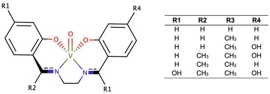 - McCaffrey, V.P.; Conover, O.Q.; Bernard, M.A.; Yarranton, J.T.; Lessnau, N.R.; Hempfling, J.P. Substituent effects in dioxovanadium(V) schiff-base complexes: Tuning the outcomes of oxidation reactions. Polyhedron 2021, 205, 115268. [Google Scholar] [CrossRef]
