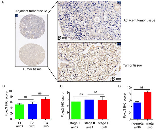 In ccRCC tissue microarray, FoxP3 was highly expressed in the tumor and might correlate with ccRCC stages. (A) Representative images of adjacent normal kidney tissues (upper panel) and kidney tissues (lower panel) after detection by IHC. (B) Histogram showing the FoxP3 average IHC score in grade T1 (53), T2 (23), and T3 (6) of ccRCC in the tissue microarray, respectively. IHC staining was graded as follows: 0 for 0%, 1 for ≤25%, 2 for 25–50%, 3 for 50–75%, and 4 for ≥75%. The IHC intensity was scored as follows: 0 for no staining, 1 for weakly positive staining, 2 for moderately positive staining, and 3 for strongly positive staining (ns: no statistical significance). (C) Histogram showing the FoxP3 average IHC score in stage Ⅰ (55), Ⅱ (23), and Ⅲ (8) of ccRCC in the tissue microarray, respectively. (D) Histogram representing the FoxP3 average IHC score in metastatic and non-metastatic ccRCC in tissue microarray, respectively (meta: metastasis occurred; no-meta: no metastasis occurred).