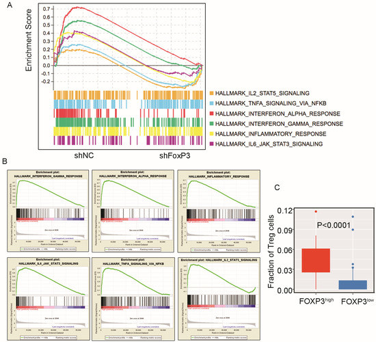 High expression of FoxP3 could activate the expression of some immune-related pathways, which could induce Treg cells’ infiltration into the tumor microenvironment. (A) Gene Set Enrichment Analysis (GSEA) images showing the difference in expression of tumor-associated pathways between FoxP3-silenced 786-O cells and normal control 786-O cells. (B) Gene Set Enrichment Analysis (GSEA) images showing the difference in expression of each pathway between the FoxP3 high-expression group (50 cases) and the FoxP3 low-expression group (50 cases), respectively. (C) Box plots representing the distribution of fraction of Treg cells in the FoxP3 high-expression group and the FoxP3 low-expression group of ccRCC patients. Circles represent abnormal values within groups (FoxP3high: FoxP3 high-expression group; FoxP3low: FoxP3 low-expression group).