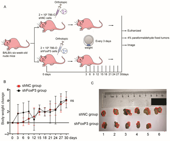 Orthotopic kidney cancer model experiments show that the inhibition of FoxP3 expression could inhibit ccRCC growth. (A) Flow chart of the orthotopic kidney cancer model experiment. BALB/c nude mice were used, with 6 mice in each group. (B) The distribution of the body weight change of the 2 groups of mice in the experiment within 30 days after the injection. The horizontal line represents the time recorded after injection, and the vertical line represents the body weight change in the two groups, respectively (error bars indicate ± SD, n = 6; ns: no statistical significance). (C) Images of the kidneys together with tumor masses of nude mice in the two groups after the experiment. Nude mice were euthanized 30 days after injection. One nude mouse in the FoxP3-silenced group was euthanized early at 24 days after injection due to poor health status. The red circled area shows the tumor masses growing from the subcapsule of the kidneys of the nude mice.