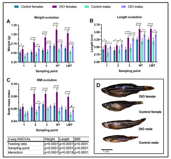 Experimental dynamics of morphological parameters. Fish were sampled every two weeks in 1, 2, 3, and NT (NTDT testing day) and one week between NT and LTM (long-term memory test probe phase). (A) Weight, (B) length, and (C) biomass index (BMI). (D) Representative images of control and OIO females and males at the end of the study. Data are expressed by mean ± SEM and analysed by two-way ANOVA and Tukey’s multiple comparison test. Asterisks indicate significant differences between OIO and control within the same gender (* p ≤ 0.05, ** p ≤ 0.01, *** p ≤ 0.001, **** p ≤ 0.0001), and # p = 0.051.