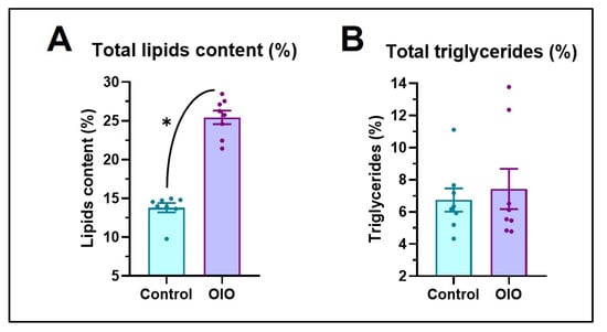 (A) The percentage of total lipids. (B) Triglyceride content (n = 8 per treatment, sex ratio 50:50). Data are expressed by mean ± SEM and analysed by an unpaired t-test (* p ≤ 0.05).