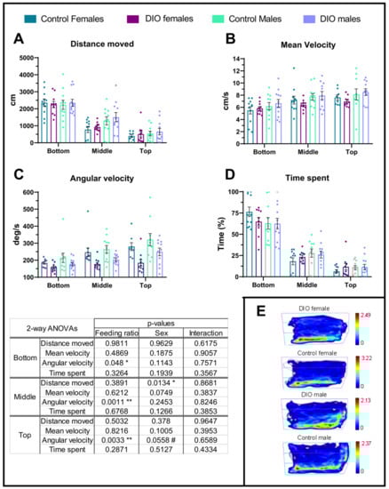Novel tank diving test (NTDT). Anxiety-like behaviours were measured in three zones: bottom, middle, and top. (A) Distance travelled, (B) mean velocity per zone, (C) angular velocity, and (D) time spent in each zone. (E) Representative heatmaps of fish movements. The colour scale represents the cumulative time spent in each of the previously defined zones: bottom, middle, and top. Data are represented by mean ± SEM and analysed by two-way ANOVA. Asterisks indicate significant differences (* p ≤ 0.05, ** p ≤ 0.01), and the hashtag indicates an apparent significant difference (# p = 0.051–0.06).