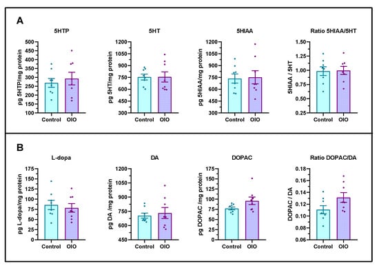 At the end of the study, OIO and control brains were dissected (8 of each genotype, sex ratio 50:50), and stored at −80 °C. The samples were thawed in ice-cold phosphate buffer (pH = 7.4, 1 M) and homogenised using an ultrasonic disruptor. Levels of 5-hydroxytryptophan (5HTP), serotonin (5-hydroxytryptamine, 5-HT), and 5-hydroxy indoleacetic acid (5HIAA) were determined using HPLC with electrochemical detection [48]. Additionally, metabolites of the dopaminergic pathway were measured: L-dihydroxyphenylalanine (L-dopa), dopamine (DA), and dihydroxyphenylacetic acid (DOPAC). The mobile phase (pH = 2.95) content was 63.9 mM NaH2PO4, 0.1 mM Na2EDTA, 0.80 mM sodium 1-octanesulfonate, and methanol 15.3% (v/v). HPLC equipment consisted of a Jasco pump (PU-2080); a reversed-phase analytical column (Phenomenex, Kinetex C18, 5 µm, 100 Å, 150 mm × 4.6 mm); an M5011 double analytical cell (first electrode: +40 mV; second electrode: +340 mV) to oxide analytes and an ESA Coulochem II detector. Results were obtained using ChromNAV 1.12 software (Jasco Corporation, Tokyo, Japan). Levels of each metabolite per total protein content in the brain (measured with BCA), 5HIAA/5HT ratio, and DOPAC/DA ratio were calculated.
