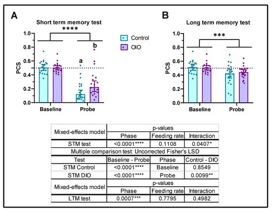 Effects of obesity on short- and long-term memory. (A) Short-term memory (STM) and (B) long-term memory (LTM). PCS, preference for conditioned stimulus. Data are represented by mean ± SEM. The dotted line indicates no stimulus preference (PCS = 0.5); low and high PCS mean less or more time spent in conditioned stimulus (CS), respectively. Results were analysed by repeated measures mixed-effect model and, when interaction was significant, uncorrected Fisher’s LSD test for multiple comparisons. Asterisks indicate significant differences between phases, baselines, and probes (* p ≤ 0.05, ** p ≤ 0.01, *** p ≤ 0.001, **** p ≤ 0.0001), and letters indicate significant differences between control and OIO probes.