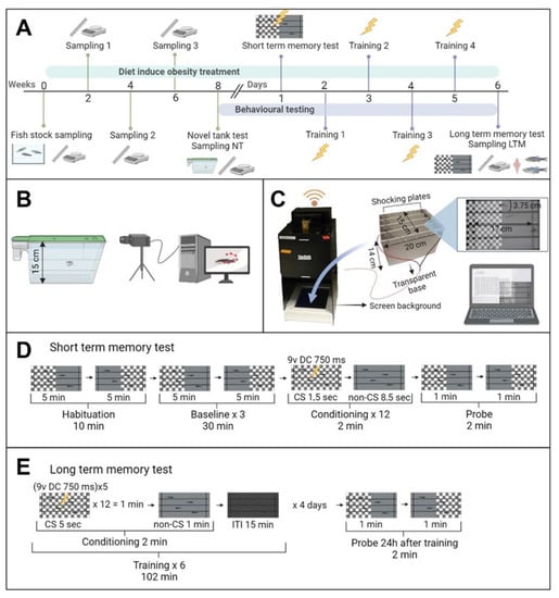 (A) Experimental design diagram. Fish from the stock were weight-graded and divided into control and overfeeding-induced obesity (OIO) groups. Animals were fed at 2 and 8%, respectively, for 8 weeks and sampled for morphological parameters every two weeks. Following the feeding protocol, the behavioural tests began with a novel tank diving test (NTDT). Animals were subsequently isolated in individual tanks for 24 h (n = 16 for each treatment). Fish were then tested for short-term memory (STM), and subsequently trained for 4 days for LTM tests. Finally, the fish were euthanised and sampled for morphological parameters. Eight fish were used for lipid quantification and the brains of the remaining eight fish were dissected for monoamine determination by HPLC. (B) Novel tank diving test setup. Fish were placed in trapezoidal tanks, and their trajectories were acquired for 10 min using Ethovision 16 XT. (C) Zantiks AD unit representation, used for aversive learning tests. (D) Short-term memory test protocol. Fish were habituated for 10 min to the experimental conditions in which the screen was half-divided into ‘check’ and ‘grey’ switching positions every 5 min. The potential preference for any background was recorded for 30 min (baseline). The same schedule used for the habituation period was then repeated 3 times. Throughout the conditioning phase, the conditioned stimulus (CS) was displayed for 1.5 s and paired to the unconditioned stimulus (US, 9 V DC shock for 750 ms) followed by 8.5 s of non-conditioned stimulus (‘check’ or ‘grey’). This protocol was repeated 12 times and learning and STM were tested for 2 min. (E) Long-term memory test protocol. Fish were initially trained for 4 consecutive days. The conditioning phase was followed by an inter-trial interval (ITI) of 15 min to allow memory consolidation, and the probe phase was performed 24 h after the last training session. The CS was displayed for 5 s and linked to the US (5 shocks of 9 V DC, 750 ms each). This protocol was repeated 12 times and subsequently non-CS was shown for 1 min followed by the ITI (absence of stimulus). Conditioning + ITI were repeated 6 times for each training session. Finally, 24 h after the last training session, the probe phase took place. In both STM and LTM tests, the preference for conditioned stimulus (PCS) was calculated as total time in CS/(time in CS + time in non-CS). Significant differences between baseline and probe PCSs were analysed. The significantly lower probe PCS, the memory enhancer, was achieved.
