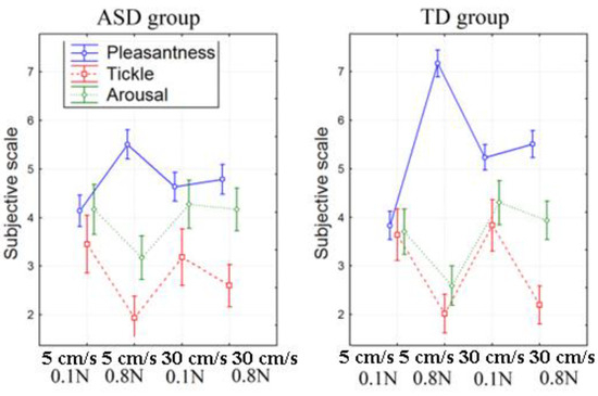 The subjects were asked to rate each type of stimulation in terms of their pleasantness, ticklishness, and arousal. TD subjects rated each type of touch as more pleasant in comparison with their ASD peers (F(1, 42) = 8.8785, p = 0.00501, partial eta-squared = 0.19). Both groups rated slow strokes with moderate force (0.8 N) as the most pleasant ones (F(3, 123) = 23.434, p < 0.000001, partial eta-squared = 0.38). TD subjects rated slow light (>0.1 N) strokes as the least pleasant (F(3, 114) = 4.0660, p = 0.00873, partial eta-squared = 0.1), while ASD participants did not distinguish it from other types of stroking. Both groups rated light strokes as the most ticklish ones (F(3, 114) = 17.878, p < 0.000001, partial eta-squared = 0.32). Differences between groups formed according to their antioxidant responses were not significant. Detailed results are presented in Table 1 and Figure 1.