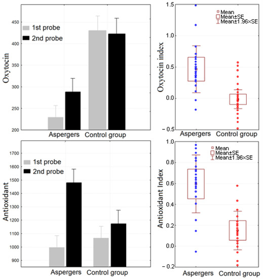 Antioxidant capacity rose after tactile stimulation (time effect F(1, 36) = 18.489, p = 0.00012, Partial eta-squared = 0.34). A post hoc Bonferroni test showed that this change was significant only in the ASD group (group × time effect F(1, 36) = 6.7253, p = 0.01366, partial eta-squared = 0.16, Bonferroni test MSE = 3163E2, df = 48,485: time effect for Asperger’s p = 0.000193, for control group p = 1). ASD participants also had a significantly higher antioxidant index (AI) (t-value = 2.67, p = 0.01).
