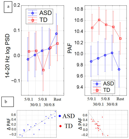 The PAF was significantly higher in all the analyzed electrodes in the TD group (group effect F(1, 42) = 7.0147, p = 0.01161, partial eta-squared = 0.15). As shown in Figure 3b, both groups showed a significant PAF increase towards stroking in comparison with the resting state for all types of stimulation, as shown with the post hoc Bonferroni test (post hoc Bonferroni test, p < 0.038). No differences in PAF were found for the Yes/No groups.