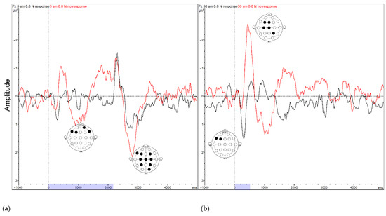For ERP analysis, the EEG recordings were filtered in the 0.1–30 range with additional 50 Hz notch filtering. Muscular and eye movement artifacts were removed with ICA, and occasional artifacts were removed manually. After that, the recordings were epoched in the range of −1000–5500 ms relative to the moment of stimulation onset. Each epoch was checked for artifacts manually by two independent experts. Each subject had more than 70% artifact-free epochs. Then, the epochs were averaged, and the grand averages for all the conditions were obtained. All the operations were made with Brain Vision Analyzer 2.2.0.7383 (Brain Products GmbH, Gilching, Germany). The latencies and amplitudes of ERPs were extracted and analyzed with Statistica 10 (Stat Soft Inc., Tulsa, OK, USA). Data were standardized, checked for normality with a Kolmogorov–Smirnov test, and further analyzed with an analysis of variance (ANOVA) and pairwise Student t-tests for single electrodes.