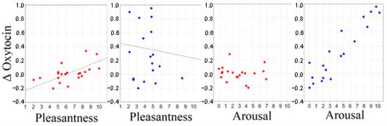 The correlation between the increase in salivary oxytocin levels and subjective ratings of stimuli differed between the ASD and TD groups. Thus, an increase in oxytocin in TD subjects correlated with higher scores on the “pleasantness” scale (r > 0.66, p < 0.005), whereas subjects with ASD had higher scores on the “arousal” scale (r > 0.61, p < 0.007). This phenomenon was most pronounced for the stimulus with the C-tactile optimal force and velocity (see Figure 5).