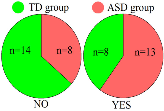 Diagram of distribution between ASD and TD group inside Yes and No groups.