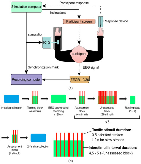 - Portnova, G.V.; Proskurnina, E.V.; Sokolova, S.V.; Skorokhodov, I.V.; Varlamov, A.A. Perceived pleasantness of gentle touch in healthy individuals is related to salivary oxytocin response and EEG markers of arousal. Exp. Brain Res. 2020, 238, 2257–2268. [Google Scholar] [CrossRef] [PubMed]