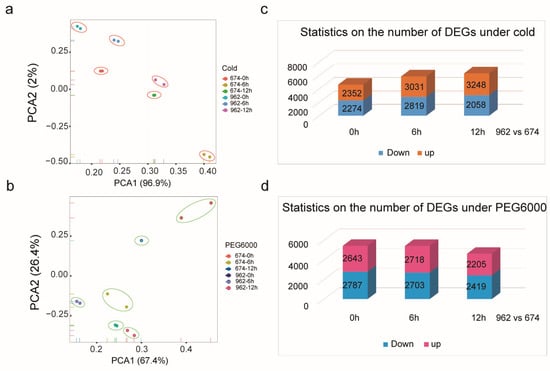 2.7. Transcriptome Data Analysis under Cold and Drought Treatments