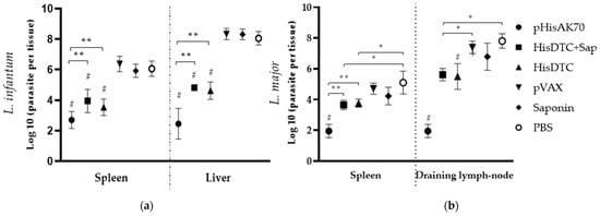 Parasite load in animals after in vivo infection. Six weeks after infection with L. infantum (a) and 7 weeks after infection with L. major, (b), animals were sacrificed, and the spleen and liver or draining lymph node were subjected to limiting dilution assay. Data are pre-sented as the mean ± SD. Hashes indicate significant differences (#, p < 0.001) between immunized (pHisAK70, HisDTC+Sap, and HisDTC) and control groups (pVAX, saponin, and PBS). Asterisks indicate differences (*, p < 0.05; **, p < 0.001).