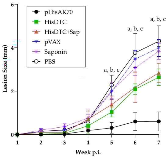 Lesion size of L. major-infected animals. Lesion size was measured by weekly evaluation during the infection. Data are presented as the mean ± S.D. Letters indicate differences (p < 0.05) between a—pHisAK70 group and the rest of the groups; b—HisDTC+Sap group and the rest of the groups except for the HisDTC group; and c—HisDTC group and the rest of the groups except for the HisDTC+Sap group.