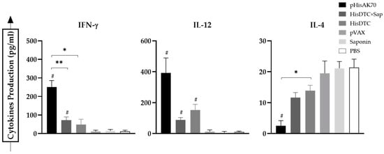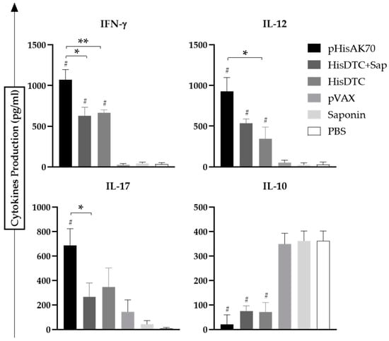 To determine whether the immune phenotype of the vaccinated and infected animals was associated with a specific predominance of characteristic cytokines of the cellular immune response, supernatants from co-cultured cells of naïve bone-marrow-derived dendritic cells (BMDCs) stimulated using soluble Leishmania antigens (SLAs) with splenocytes of immunized and infected animals were evaluated. The pro-inflammatory (IFN-γ, IL-12, and IL-17) as well as anti-inflammatory (IL-10 or IL-4) cytokine production was quantified using ELISA kits. All vaccinated and L. infantum-infected animals presented statistically (p < 0.05) higher levels of specific IFN-γ and IL-12 when compared with control groups, thus indicating the ability of the pHisAK70 and HisDTC w/o saponin formulations to induce a predominance of proinflammatory cytokines characteristic of cellular immune response (Figure 3). Among the three vaccine formulations, the plasmid DNA was able to induce the highest production of both cytokines, which could be related to the greater control of parasite multiplication achieved in target organs. When considering the anti-inflammatory cytokines, it is worth noting that, in the VL model, all vaccine formulations were able to decrease with statistical significance (p < 0.05) the IL-10 production when compared to control groups. This Th1 cytokine bias towards IFN-γ/IL-12 pro-inflammatory cytokines was correlated with the IL-17 cytokine production, as previously described [,].