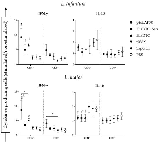 CD4+ and CD8+ T-cell involvement in the production of IFN-γ and IL-10. After sacrifice, some of the spleen cell suspensions were stimulated with specific L. infantum or L. major SLAs. The intracytoplasmic production of IFN-γ and IL-10 by CD4+ and CD8+ cells was measured by flow cytometry. Data are presented as the ratio between stimulated and non-stimulated cells. Data are presented as the mean ± SD. Hash marks indicate significant differences (#, p < 0.05) between immunized and control (pVAX, saponin, and PBS) groups. Asterisks indicate significant differences (*, p < 0.05).