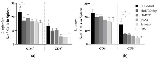 CD4+ and CD8+ T-cell population in spleens of L. infantum- (a) and L. major- (b) infected animals. After sacrifice, some spleen cell suspensions were stimulated with specific L. infantum or L. major SLAs. The percentage of live CD4+ and CD8+ cells were quantified by flow cytometry. Data are presented as the ratio between stimulated and non-stimulated cells. Data are presented as the mean ± SD. Hash marks indicate significant differences (#, p < 0.05) between immunized and control (pVAX, saponin, and PBS) groups. Asterisks indicate significant differences (*, p < 0.05).