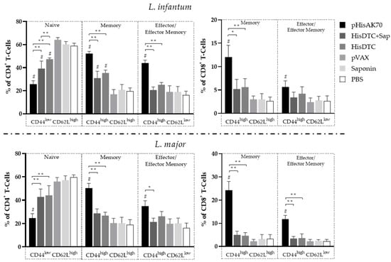 Remarkably, only animals vaccinated with pHisAK70 exhibited an increased count of both CD4+ T and CD8+ T cells in the spleen when challenged with L. infantum, whereas, when infected with L. major, only an increment in the CD8+ T-cell population was observed (Figure 6).