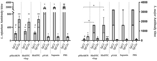 Finally, following the identification of a reduction in parasite burden in target organs as a result of vaccination, we investigated the immune correlates of protection associated with immunoglobulin (Ig) production. To assess the humoral response in the animals, we quantified specific anti-SLA antibodies (Figure 8). In the case of animals infected with L. infantum, in the vaccinated groups, protection was correlated with a redirection of the IgG subclass toward the Th1-related IgG2a subclass of SLA-specific antibodies. Conversely, animals in the control groups (pVAX, saponin, and PBS) that were unable to control parasite multiplication exhibited predominantly Th2-related IgG1 subclass production. Regarding animals infected with L. major, the predominance of IgG2a antibody production over IgG1 was only detected in the pHisAK70 group, which was also correlated with a reduction in parasite burden.