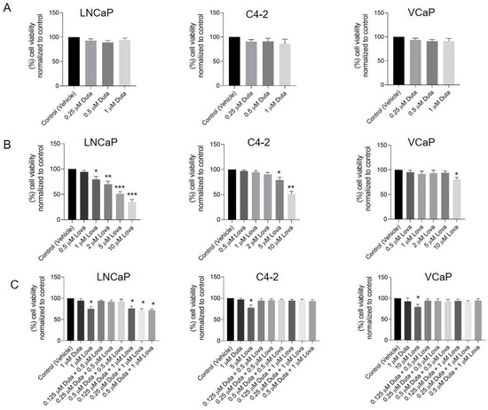 Treatment with different concentrations of Lova alone and the combination of Duta + Lova leads to reduced prostate cancer cell viability. Cell viability was assessed by CellTiter-Glo 2.0 assay. LNCaP and C4-2 cells were treated for 7 days with vehicle control (0.1% DMSO) or different concentrations of (A) Duta (0.25, 0.5 and 1 μM), (B) Lova (0.5, 1, 2, 5 and 10 μM) and (C) Duta + Lova combination (0.125 μM Duta + 0.5 μM Lova, 0.25 μM Duta + 0.5 μM Lova, 0.5 μM Duta + 0.5 μM Lova, 0.125 μM Duta + 1 μM Lova, 0.25 μM Duta + 1 μM Lova and 0.5 μM Duta + 1 μM Lova). VCaP cells were treated with the same conditions (Duta, Lova and Duta + Lova combination) for 14 days. The results are presented as percentage of cell viability normalized to control. Data are shown as mean with standard error of the mean (±SEM) of three independent experiments: * p < 0.05, ** p < 0.01, *** p < 0.001. DMSO, dimethyl sulfoxide.