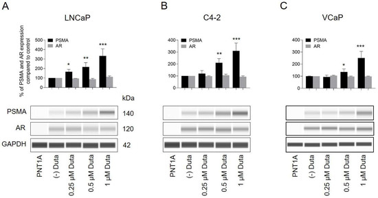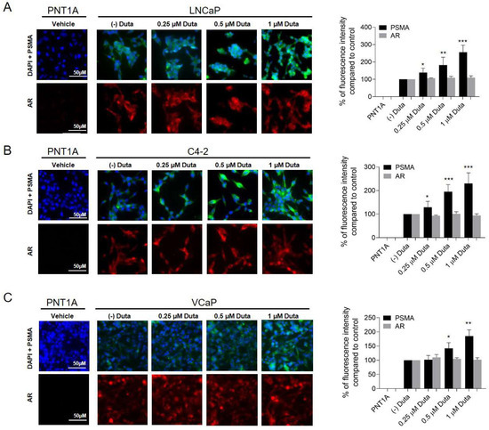 The visualization of cell surface PSMA and AR expression in prostate cancer cells was performed by immunocytochemistry. LNCaP cells treated for 7 days with 0.25 μM (139 ± 25%, p < 0.05), 0.5 μM (182 ± 45%, p < 0.01) and 1 μM (256 ± 40% p < 0.001) Duta showed a significant increase in cell surface PSMA expression compared to the vehicle control (Figure 5A). Similar results were observed in C4-2 cells (Figure 5B). In VCaP cells, only treatments with 0.5 μM (143 ± 21%, p < 0.05) and 1 μM (185 ± 22% p < 0.01) Duta for 14 days showed a significant increase in cell surface PSMA expression (Figure 5C). However, AR expression was not influenced in LNCaP, C4-2 and VCaP cells when different concentrations of Duta were applied (Figure 5).