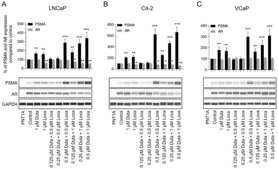 Treatment of prostate cancer cells with different concentrations of Duta + Lova leads to increased total PSMA expression and reduced AR expression. Whole PSMA protein expression analyzed by protein simple immunoblotting. (A) LNCaP and (B) C4-2 cells were treated for 7 days with different concentrations of Duta + Lova combination (0.125 μM Duta + 0.5 μM Lova, 0.25 μM Duta + 0.5 μM Lova, 0.5 μM Duta + 0.5 μM Lova, 0.125 μM Duta + 1 μM Lova, 0.25 μM Duta + 1 μM Lova and 0.5 μM Duta + 1 μM Lova). (C) VCaP cells were treated for 14 days with the same Duta + Lova concentrations. PSMA and AR expressions are presented as the percentage of PSMA and AR expression compared to vehicle control. Data are shown as mean with standard error of the mean (±SEM) of three independent experiments. * p < 0.05, ** p < 0.01, *** p < 0.001.