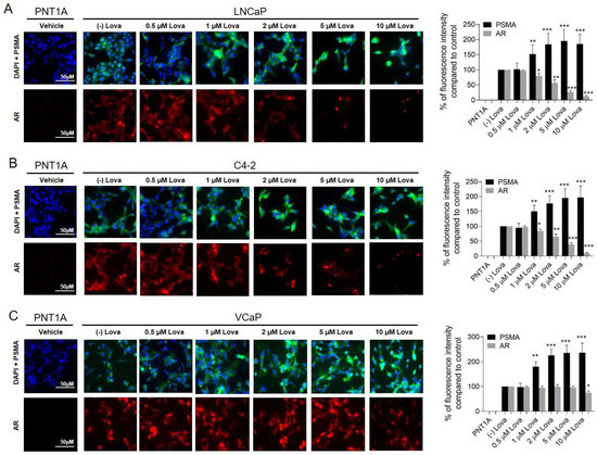 Treatment of prostate cancer cells with different concentrations of Lova leads to increased cell surface PSMA expression and reduced AR expression. Visualization of surface PSMA and AR expression using immunocytochemistry after Lova treatment. LNCaP cells (A) and C4-2 cells (B) were cultured on chamber slides and incubated for 7 days with vehicle control (0.1% DMSO) or different concentrations of Lova (0.5, 1, 2, 5 and 10 μM). (C) VCaP cells were cultured for 14 days with the same Lova concentrations. PSMA and AR cell surface expressions are presented as the percentage of fluorescence intensity compared to control. * p < 0.05, ** p < 0.01, *** p < 0.001. Scale bars indicate 50 μM.