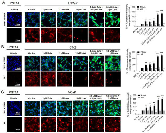 Treatment of prostate cancer cells with different concentrations of Duta + Lova leads to increases cell surface PSMA expression and reduced AR expression. Visualization of surface PSMA and AR expression using immunocytochemistry after combined Duta/Lova treatment. LNCaP cells (A) and C4-2 cells (B) were cultured on chamber slides and incubated for 7 days with vehicle control (0.1% DMSO) or different concentrations of Duta + Lova (0.125 μM Duta + 0.5 μM Lova, 0.25 μM Duta + 0.5 μM Lova, 0.5 μM Duta + 0.5 μM Lova, 0.125 μM Duta + 1 μM Lova, 0.25 μM Duta + 1 μM Lova and 0.5 μM Duta + 1 μM Lova). (C) VCaP cells were cultured for 14 days with the same Duta + Lova concentrations. PSMA and AR cell surface expressions are presented as the percentage of fluorescence intensity compared to control. * p < 0.05, ** p < 0.01, *** p < 0.001. Scale bars indicate 50 μM.