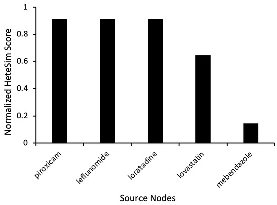 As evidenced by relevant HeteSim scores of 0.911, the results most notably show piroxicam, leflunomide, and loratadine as having comparatively high levels of relatedness to levodopa (Figure 2). Piroxicam is a non-steroidal anti-inflammatory drug (NSAID) commonly used to treat rheumatic diseases [13]. Similarly, leflunomide is a disease-modifying antirheumatic drug (DMARD) used to treat rheumatoid arthritis. The medication has anti-inflammatory and immunoregulatory properties [14]. Loratadine is a second-generation antihistamine commonly used to treat allergies [15]. Less related simulation results included lovastatin, a medication used to treat high cholesterol. It yielded a HeteSim score of 0.645, while mebendazole, an anthelmintic medication, had a HeteSim score of 0.146 (Figure 2).
