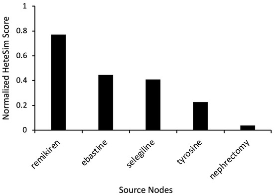 To further investigate the antihistamine drug type and explore non-conventional drugs predicted to modulate dopamine, additional simulations were performed with the target nodes as “Dopamine” and “Antihistamine”, as shown in Figure 1. The number of Unified Medical Language System (UMLS) source node types used was increased to expand the scope of the search. Instead of only using the category “Clinical Drug” (CLND), the source node types “Pharmacologic Substance” (PHSU) and “Therapeutic or Preventative Procedure” (TOPP) were also added. These simulations yielded results from drug categories like renin inhibitors (remikiren), antihistamines (ebastine), and antidepressants (selegiline). Ebastine had a HeteSim score of 0.447 (Figure 3).