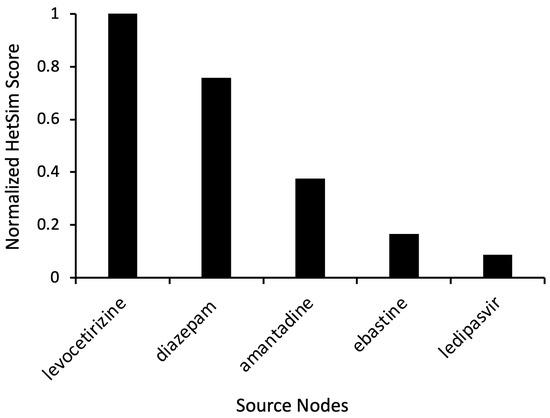 Based on the preliminary simulation results and corresponding HeteSim scores, additional simulations were run with the target nodes set to “Antihistamine” and “Levodopa” (Figure 1). Levocetirizine displayed a high HeteSim relatedness score of 0.999, and the HeteSim score for ebastine was 0.166 (Figure 4). The notable appearance and reappearance of antihistamines like levocetirizine and ebastine, respectively, suggested the need for further analysis of these specific drugs. As shown in Figure 4, other simulation results included anxiolytics (diazepam), dopamine agonists (amantadine), and drugs used to treat hepatitis C (ledipasvir).