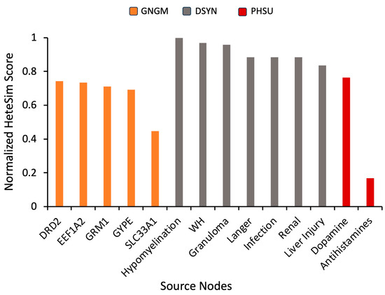 In order to identify highly connected hub nodes of significance, a supplemental simulation was run using “Parkinson’s disease” as the target node. The UMLS node types were assigned to be “Disease or Syndrome” (DSYN), “Gene and Genome” (GNGM), or pharmacologic substance (PHSU). Using the hub analysis process detailed in Section 4.3, source nodes with highly ranked HeteSim scores were selected for further analysis from the simulation results (Figure 5). The 14 source nodes included DRD2, EEF1A2, GRM1, GYPE, SLC33A1, hypomyelination, WH (Werdnig Hoffmann paralysis), granuloma (granuloma of intestine), Langer (Langer mesomelic dysplasia syndrome), infection (infection in the elderly), renal (high renal threshold for glucose), liver injury, dopamine, and antihistamines. Note that dopamine and antihistamines were recurring source nodes.