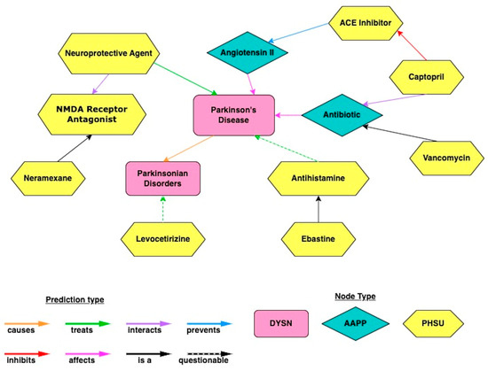 Figure 6 illustrates the overview of the cross-domain text-mining method. Data were extracted from the text of journal articles contained within the PubMed database. Then, text relationships were identified as subject–object–predicate triples, which connect two nodes together. A collection of relationship triples constitutes a knowledge graph. By ranking such relationships, potential repurposed drugs for PD were identified. Figure 7 depicts an example subgraph from the larger knowledge graph. The visualized subgraph is highly pruned (>99.9% pruned). The full knowledge graph cannot be shown as it is too large and intractable to visualize with the human eye. The shapes in Figure 7 represent nodes, which are biomedical concepts found in the literature as defined by the UMLS ontology. Example node types included are “Pharmacologic Substance” (PHSU), “Amino Acid, Peptide, or Protein” (AAPP), and “Disease or Syndrome” (DSYN). Finally, cross-domain text-mining analysis to identify repurposed drug candidates for PD was performed using a form of hub node network analysis we previously described [10]. Hub node network analysis enables more distant cross-domain relationships in the knowledge graph to be fairly represented in the resultant drug candidate rankings.