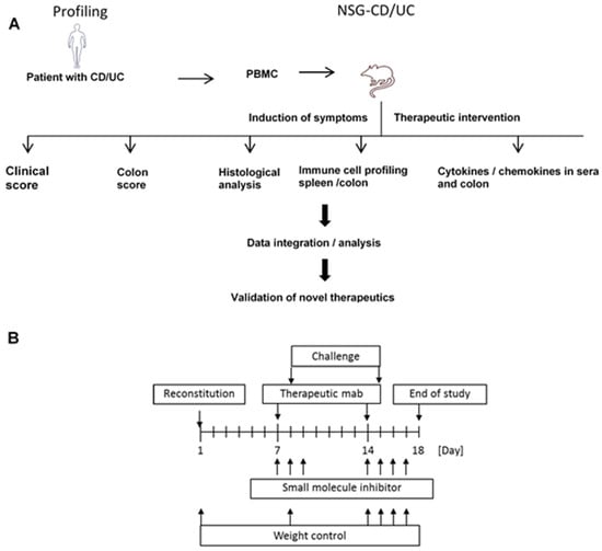Inflammatory bowel disease (IBD), comprising Crohn’s disease (CD) and ulcerative colitis (UC), is an idiopathic, chronic, inflammatory disorder of the gastrointestinal tract. Its prevalence is increasing worldwide, currently affecting 3.5 million people in Europe and North America [1,2]. The immune-pathogenesis of CD and UC is not fully understood; however, it is presently thought that genetic pre-dispositions, along with environmental factors, contribute to a breach of tolerance against the colonic microbiome, leading to excessive intestinal inflammation [3,4,5]. Currently, the differential diagnosis of UC and CD relies on endoscopic and histological analyses [6]. UC is characterized by superficial mucosal inflammation and rectal bleeding restricted to the colon. In contrast, CD involves transmural inflammation, which can cause perforation, strictures and extensive fibrosis, and can affect the entire gastrointestinal tract. UC and CD are both umbrella diagnoses covering multiple disease forms that are distinguished by clinical manifestation, severity, course and response to therapeutics. As a result, IBD patients frequently require multiple medical treatment approaches during the course of their disease, causing severe side effects for patients and a high financial burden for health care systems [7]. In cases of a therapy-refractory disease, surgery may be required for both CD and UC [8]. Therefore, there is an urgent medical need for IBD patient stratification for individualized and phase-adapted treatment regimen. This approach has to be matched with animal models to validate the assumed response to a given therapeutic in a selected patient group. In most IBD models, colitis-like symptoms are induced by exposure to chemical substances such as dextran sodium sulfate (DSS) [9] or 2,4,6-trinitrobenzenesulfonic acid (TNBS) [10], causing a highly pro-inflammatory response. In another study, inflammatory symptoms were induced by rectal application of 50% ethanol [11]. However, these models neither reflect the heterogeneous symptoms observed in IBD patients nor the pathophysiological mechanisms of a heterogeneous patient population often suffering from these diseases for decades. To overcome these shortcomings, we developed UC and CD models based on NOD/SCID/IL2rγnull (NSG) mice reconstituted with peripheral blood mononuclear cells (PBMCs) from patients with UC (NSG-UC) or CD (NSG-CD). In these models, the immunological background of the donor is partially maintained, and the observed pathological manifestations include inflammation, edema, crypt elongation, tufting, fibrosis and strictures. The NSG-UC model predominantly exhibits a pro-inflammatory response, while the NSG-CD model demonstrates remodeling of the colon, including extensive fibrosis. In the present study, we characterized and compared both models to highlight their different manifestations and potential advantages over conventional IBD models.